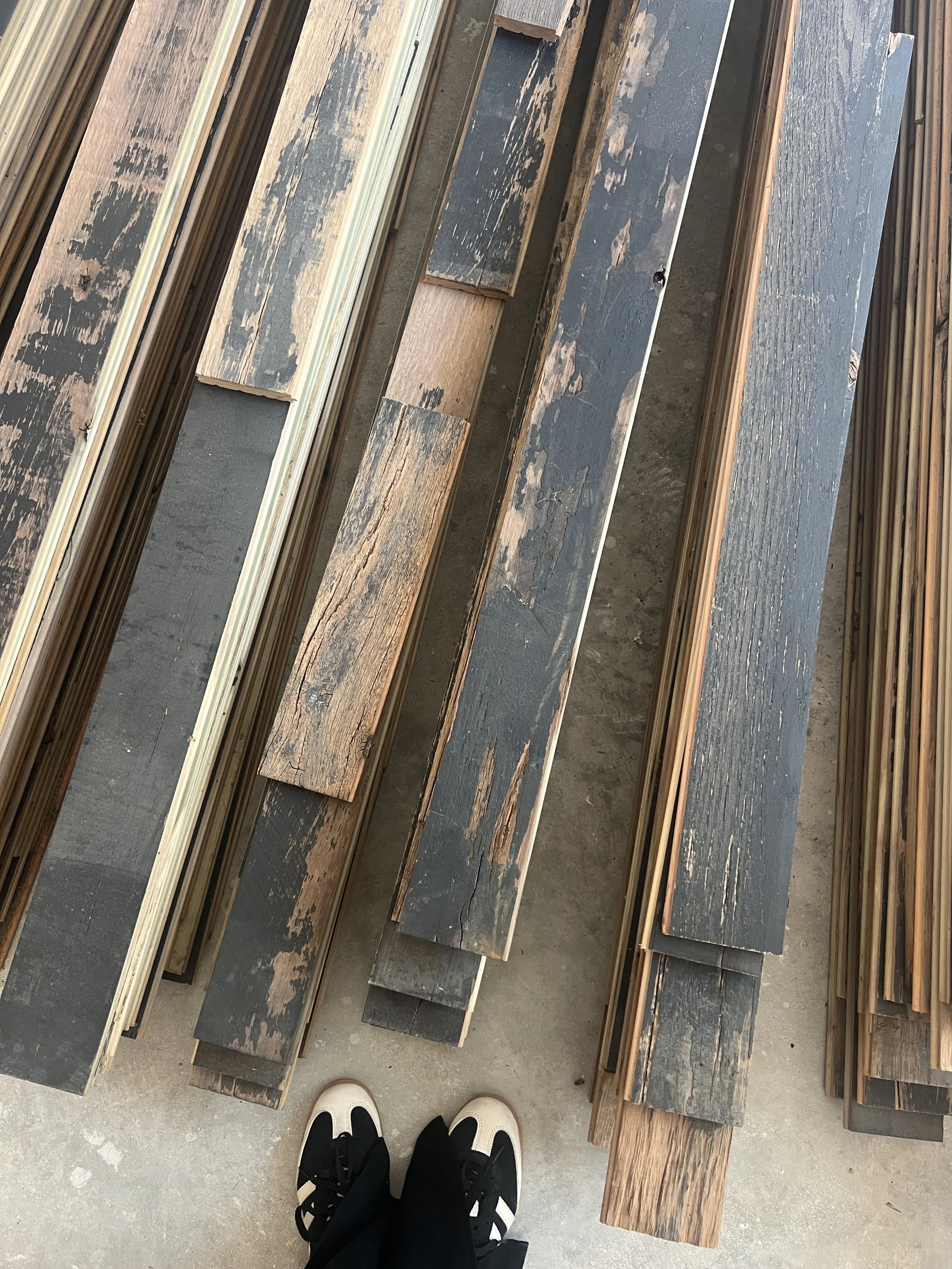 While walking through the barns, we were looking for antique white oak flooring. But while digging through the piles, we stumbled across something unexpected: salvaged fencing that had been milled into flooring.