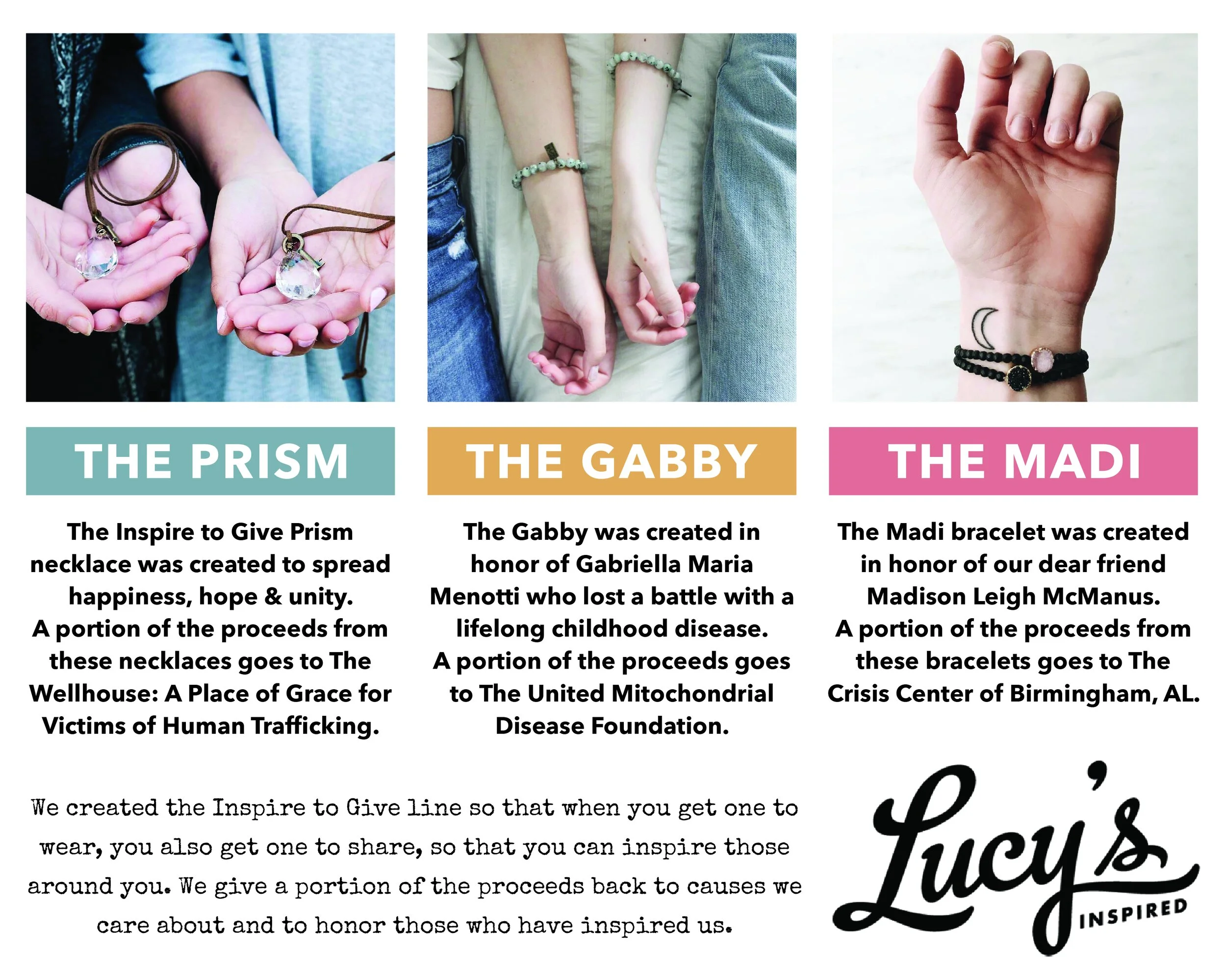 Gabriella Menotti inspired the Gabby Bracelet. Her mom, Tracy, and I are friends. She made bracelets as she cared for her daughter Gabby, who had mitochondrial disease, and when Gabby passed away, I asked if I could honor her with a piece of jewelry for the Inspire to Give Collection. We set up a fund in Gabby’s honor with the Mitochondrial Foundation. You can read more about Mitochondrial Disease HERE.