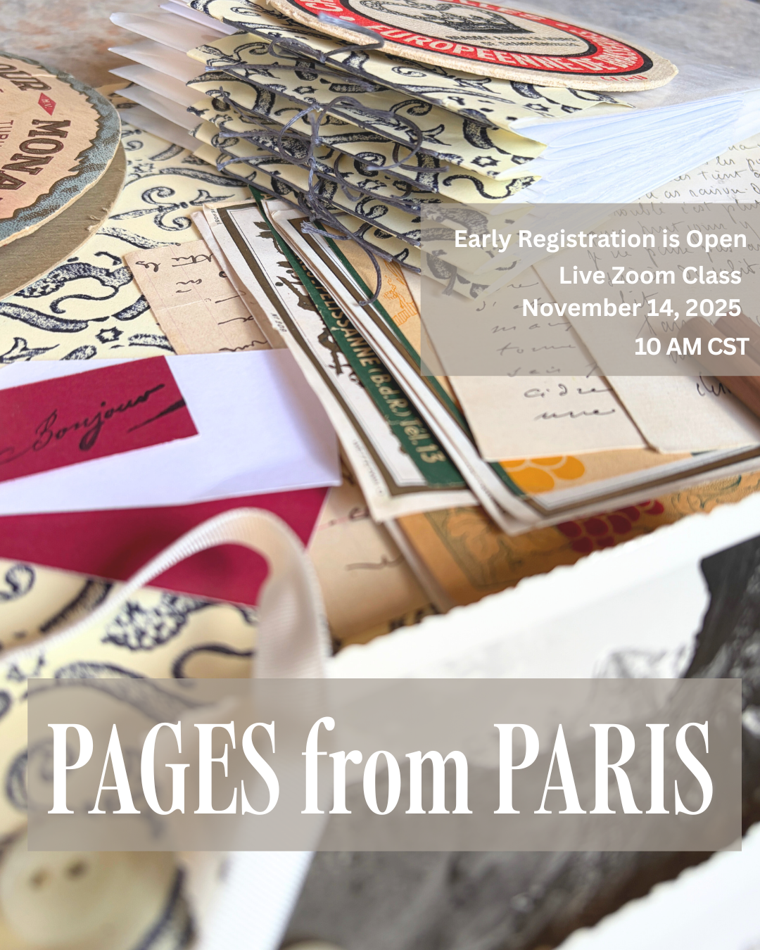 In Pages from Paris, we’ll create a handmade book inspired by my vintage finds from France. I’ll guide you through simple bookbinding and collage techniques that turn paper, texture, and ephemera into something meaningful and beautiful.